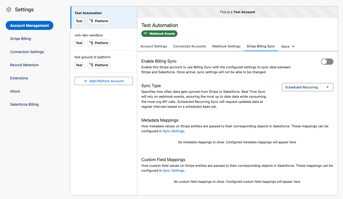 - 1-click Billing data sync: Enable real-time or scheduled Stripe billing data synchronization to Salesforce with a single click, simplifying integration maintenance.