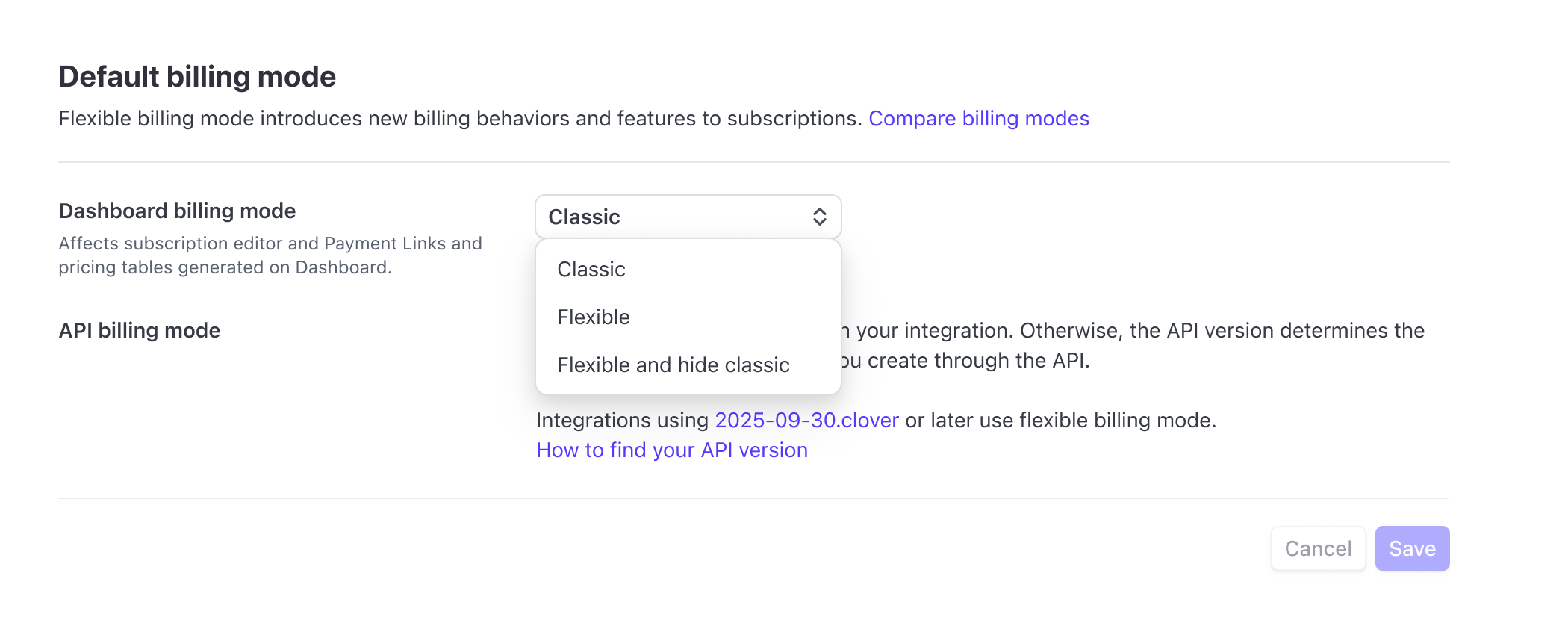 For existing users, your default billing mode is preserved as classic to maintain backward compatibility with your current integration. However, we recommend migrating to flexible billing mode to take advantage of the latest billing features and improvements. Learn more about the differences between classic and flexible billing mode.