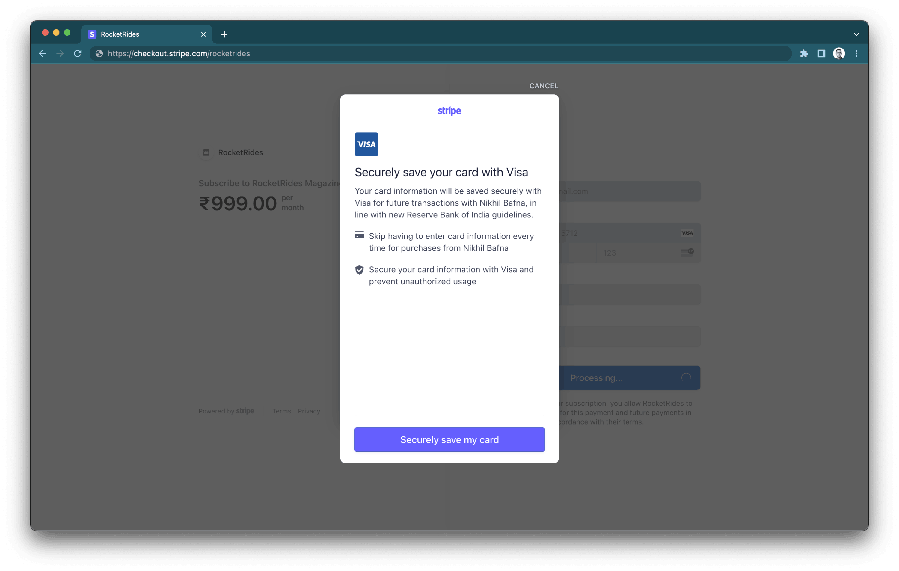 For more details on the updated requirements to have a compliant integration with Stripe, see Saving cards in India.