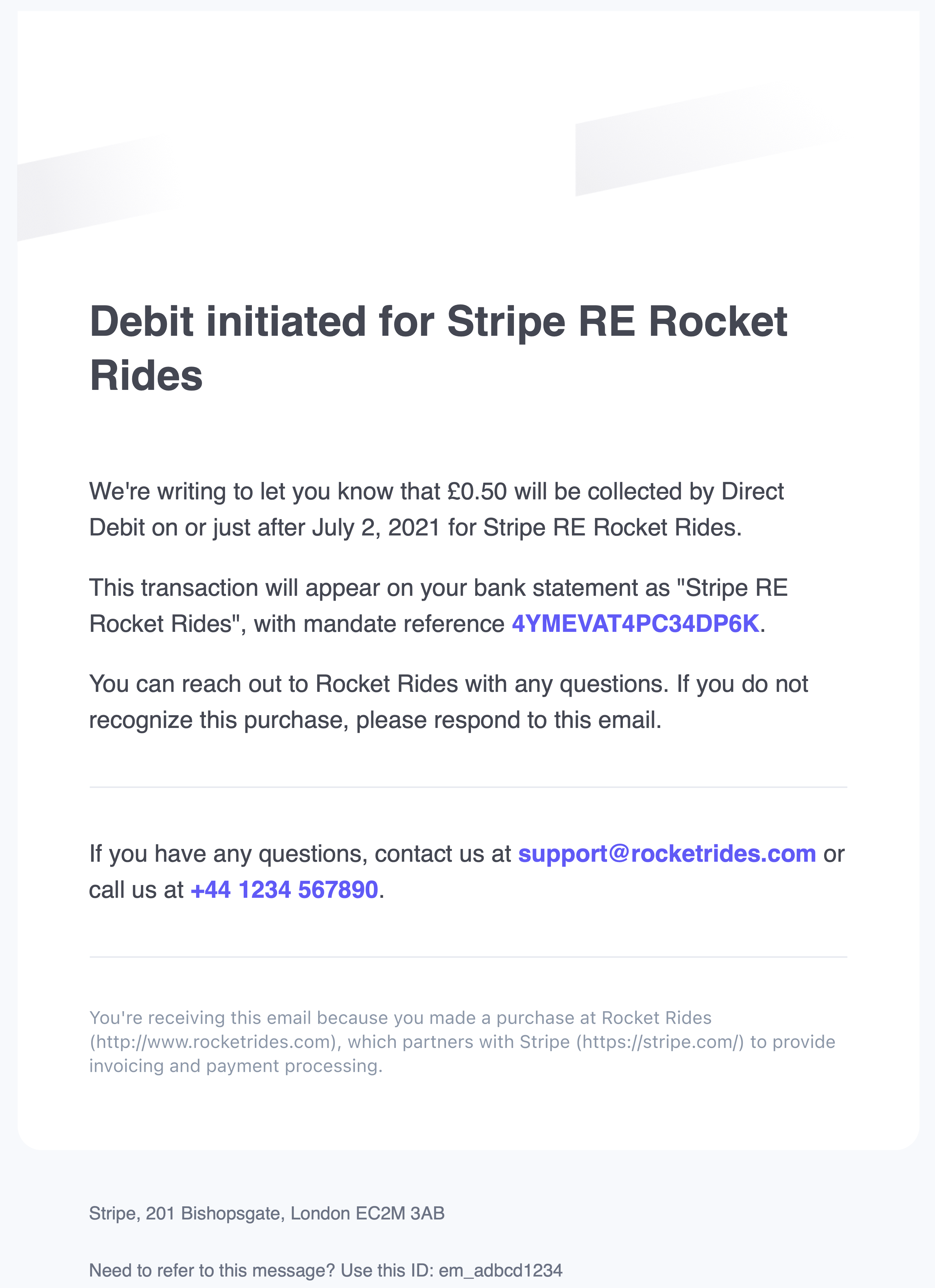 - The Direct Debit due date (day, month, and year)—this will be 2 business days after the PaymentIntent is created in Stripe