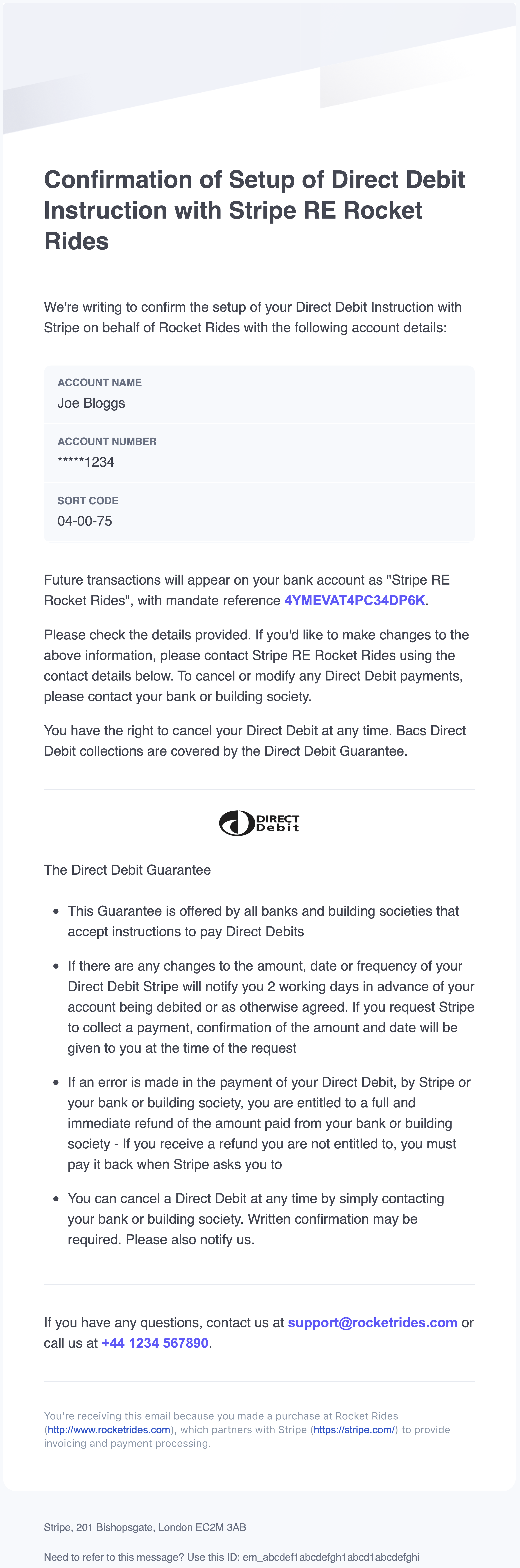 - The unedited Stripe Direct Debit Guarantee, including the Direct Debit logo