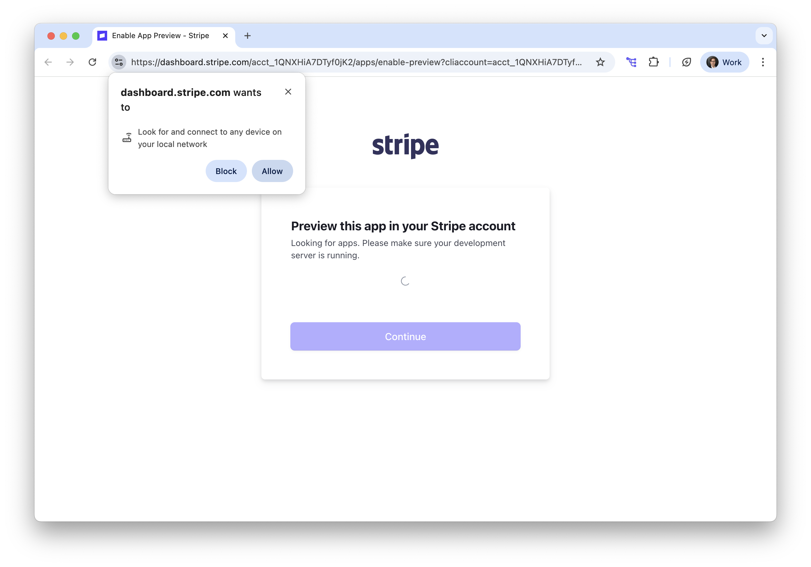 stripe apps start. - You’ll see a prompt on the enable preview page asking you to grant LNA to the Stripe Dashboard. See Getting started with Stripe Apps to learn more.